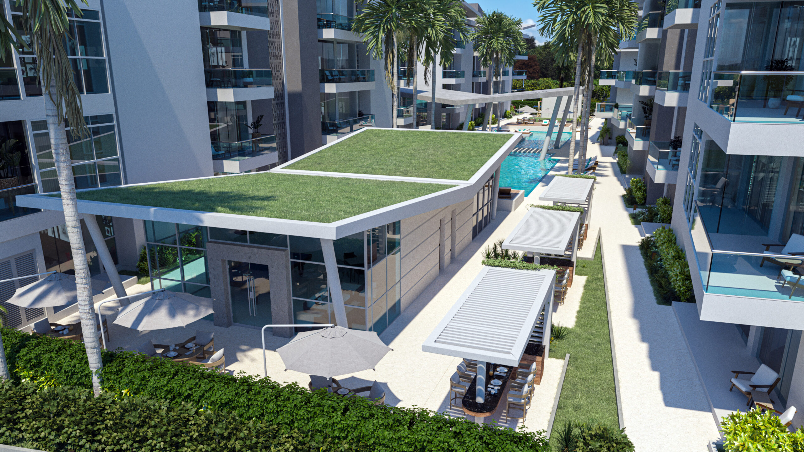Ubicado en un terreno de 9535 mts2, con 80 apartamentos distribuidos en cuatros módulos diseñados bajo el concepto de estética, comodidad, funcionalidad, lujo y confort; unidos por un corredor central dedicado a las amenidades y áreas de esparcimiento.